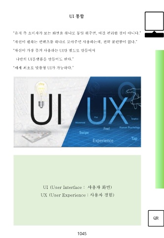 UI 통합 “유저 즉 소비자가 보는 화면을 하나로 통일 해주면, 여간 편리한 것이 아니다.” “자신이 원하는 컨텐츠를 하나로 모아주면 사용하는데, 전혀 불편함이 없다.” “자신이 가장 즐겨 사용하는 UI만 별도로 만들어서 나만의 UI플랫폼을 만들어도 된다.” “세계 최초로 맞춤형 UI가 가능하다.” UI (User Interface : 사용자 화면) UX (User Experience : 사용자 경험) QR 1045