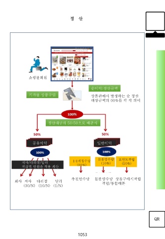 정 산 쇼핑몰회원 순이익:정산금액 기가몰 상품구입 상품판매시 발생하는 순 정산 대상금액의 00%를 각 각 의미 정산대금의 50:50으로 배분시 공유이익 일반이익 몰분양수당 포인트적립 1:1매칭수당 지사/대리점/딜러 (10%) (10%) 직급별 인원을 적용 계산 (80%) 추천인수당 몰분양수당 상품구매시적립 회사 지사 대리점 딜러 적립/통합배분 (30/N) (10/N) (1/N) QR 1053
