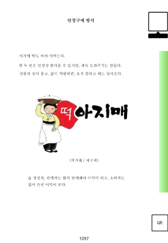 인정구매 방식 아지매 떡도 싸야 사먹는다. 한 두 번은 인정상 팔아줄 수 있지만, 계속 도와주기는 힘들다. 상품의 질이 좋고, 값이 저렴하면, 오지 말라고 해도 찾아온다. (직거래 / 재구매) ♤ 생산자, 판매자는 많이 판매해야 이익이 되고, 소비자는 많이 쓰면 이익이 된다. QR 1097