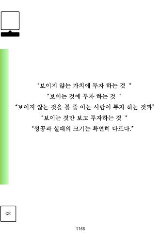 “보이지 않는 가치에 투자 하는 것“ “보이는 것에 투자 하는 것“ “보이지 않는 것을 볼 줄 아는 사람이 투자 하는 것과” “보이는 것만 보고 투자하는 것“ “성공과 실패의 크기는 확연히 다르다.” QR 1166