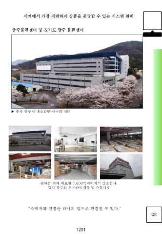 세계에서 가장 저렴하게 상품을 공급할 수 있는 시스템 완비 충주물류센터 및 경기도 광주 물류센터 ▶ 충북 충주시 대소원면 금곡리 456 판매를 위해 확보한 7,000억원어치의 상품들과 경기 광주의 오프라인매장 및 스튜디오 “소비자와 현장을 하나의 앱으로 연결할 수 있다.” QR 1201