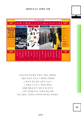 멀티비즈니스 유형의 사업 차량판매 화장품 가전제품 패션 숫자도메인 UI상에서 유형의 사업을 선택하면, 수많은 회사가 나오고 그 회사를 선택하면 그 회사가 갖고 있는 상품이 나오며, 그 상품을 누르면 그 상품과 관련된 자세한 내용을 볼 수 있도록 한 것이다. 그것이 멀티비즈니스 속에서 동일 UI에 동일 상품을 구축하여 소비자의 편리성을 갖추었다. QR 1231