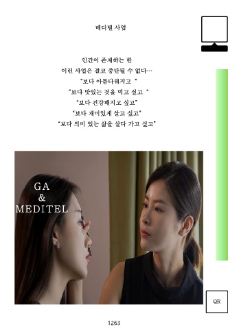 메디텔 사업 인간이 존재하는 한 이런 사업은 결코 중단될 수 없다… “보다 아름다워지고“ “보다 맛있는 것을 먹고 싶고“ “보다 건강해지고 싶고” “보다 재미있게 살고 싶고” “보다 의미 있는 삶을 살다 가고 싶고” GA & MEDITEL QR 1263