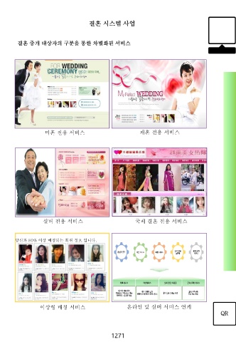 결혼 시스템 사업 결혼 중개 대상자의 구분을 통한 차별화된 서비스 미혼 전용 서비스 재혼 전용 서비스 실버 전용 서비스 국제 결혼 전용 서비스 당신과 80% 이상 매칭되는 회원 정보 입니다. 이상형 매칭 서비스 온라인 및 실버 서비스 연계 QR 1271