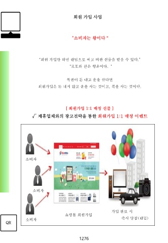 회원 가입 사업 “소비자는 왕이다" “회원 가입만 하면 랜덤으로 싸고 비싼 선물을 받을 수 있다.” “로또와 같은 행운이다.“ 복권이 돈 내고 운을 산다면 회원가입은 돈 내지 않고 운을 사는 것이고, 복을 사는 것이다. [ 회원가입 1:1 매칭 선물 ] √ 제휴업체와의 광고전략을 통한 회원가입 1:1 매칭 이벤트 소비자 소비자 가입 완료 시 쇼핑몰 회원가입 소비자 즉시 당첨(랜덤) QR 1276
