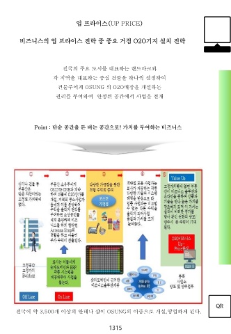 업 프라이스(UP PRICE) 비즈니스의 업 프라이스 전략 중 중요 거점 O2O기지 설치 전략 전국의 주요 도시를 대표하는 랜드마크와 각 지역을 대표하는 중심 건물을 하나씩 선정하여 건물주에게 OSUNG 의 O2O매장을 개설하는 권리를 부여하여 안정된 공간에서 사업을 전개 Point : 단순 공간을 돈 버는 공간으로! 가치를 부여하는 비즈니스 QR 전국에 약 3,500개 이상의 안테나 샵이 OSUNG의 이름으로 개설,영업하게 된다. 1315