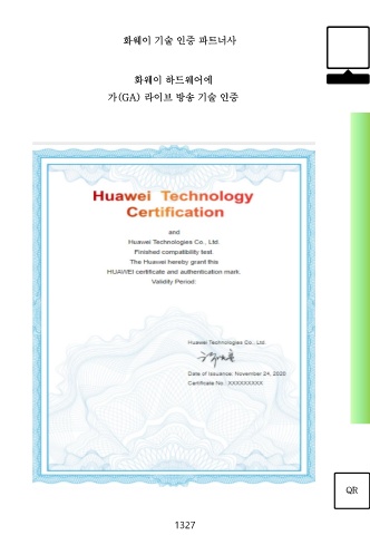 화웨이 기술 인증 파트너사 화웨이 하드웨어에 가(GA) 라이브 방송 기술 인증 QR 1327