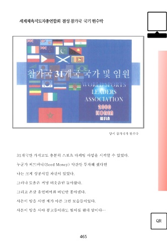 세계체육지도자총연합회 결 성 참가국 국 기 현수막 당시 참가국가 현수막 31개국만 가지고도 충분히 스포츠 마케팅 사업을 시작할 수 있었다. 누군가 씨드머니(Seed Money) 약간만 투자해 줬다면 나는 크게 성공시킬 자신이 있었다. 그러나 도움은 커녕 비웃음만 돌아왔다. 그리고 온갖 유언비어와 비난만 쏟아냈다. 사돈이 땅을 사면 배가 아픈 그런 모습들이었다. 사돈이 땅을 사야 콩고물이라도 떨어질 텐데 말이다… QR 465