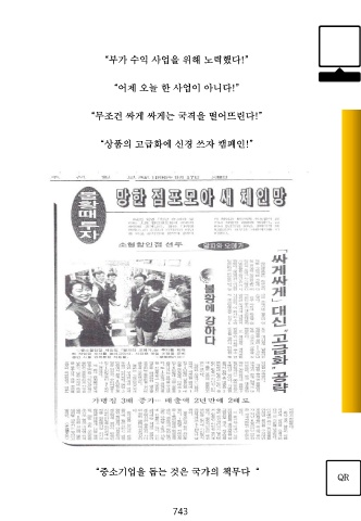 “부가 수익 사업을 위해 노력했다!” “어제 오늘 한 사업이 아니다!” “무조건 싸게 싸게는 국격을 떨어뜨린다!” “상품의 고급화에 신경 쓰자 캠페인!” “중소기업을 돕는 것은 국가의 책무다“ QR 743