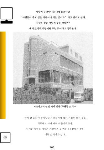 사랑이 무엇이냐고 내게 묻는다면 “아낌없이 주고 싶은 사람이 생기는 것이다.”라고 말하고 싶다. 사랑은 받는 것일까 주는 것일까? 내게 있어서 사랑이란 주는 것이라고 생각한다. <㈜지오비 인천 지사 건물(구월동 소재)> 함께 땀 흘리며 살아왔던 사람들에게 내가 가졌던 모든 것을 기부하고 나니 너무나 홀가분하다. 내게는 일하는 자체가 기쁨이지 무엇을 소유한다는 것은 아무런 의미가 없다. QR 768