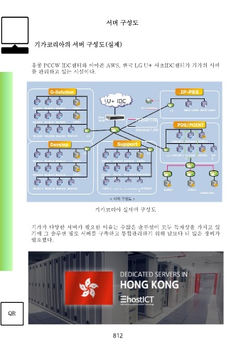서버 구성도 기가코리아의 서버 구성도(실제) 홍콩 PCCW IDC센터와 아마존 AWS, 한국 LG U+ 서초IDC센터가 기가의 서버 를 관리하고 있는 시설이다. 기가코리아 실서버 구성도 기가가 다양한 서버가 필요한 이유는 수많은 솔루션이 모두 독자성을 가지고 있 기에 그 솔루션 별로 서버를 구축하고 통합관리하기 위해 남보다 더 많은 장비가 필요했다. QR 812