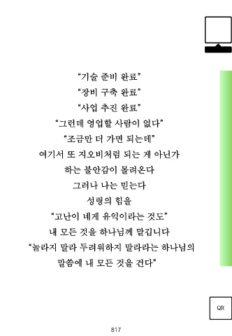 “기술 준비 완료” “장비 구축 완료” “사업 추진 완료” “그런데 영업할 사람이 없다” “조금만 더 가면 되는데” 여기서 또 지오비처럼 되는 게 아닌가 하는 불안감이 몰려온다 그러나 나는 믿는다 성령의 힘을 “고난이 네게 유익이라는 것도” 내 모든 것을 하나님께 맡깁니다 “놀라지 말라 두려워하지 말라라는 하나님의 말씀에 내 모든 것을 건다” QR 817