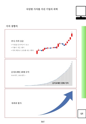 다양한 가치를 가진 기업의 위력 가치 경향치 주식 가치 상승 • 마진율(순수익)이 높고 • 지출이 적은 회사 • 세계 최초로 공유와 나눔 회사 숫자도메인 판매 수익 100개국, 200개국… 특허의 평가 QR 841