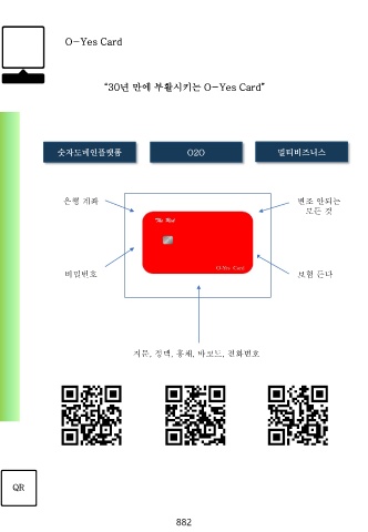 O-Yes Card “30년 만에 부활시키는 O-Yes Card” 숫자도메인플랫폼 O2O 멀티비즈니스 은행 계좌 변조 안되는 모든 것 비밀번호 보험 든다 지문, 정맥, 홍채, 바코드, 전화번호 QR 882