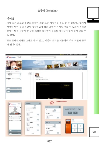 솔루션(Solution) 마이홈 마이 홈은 프로필 화면을 통하여 개인 또는 가맹점을 홍보 할 수 있으며, PC에서 작성한 마이 홈의 본인이 작성하고자 하는 글에 이미지도 넣을 수 있으며 온라인 상에서 다른 사람이 쓴 글을 그대로 복사하여 본인의 게시글에 쉽게 붙여 넣을 수 도 있다. 글은 모바일에서도 그대로 볼 수 있고, 피플러 찾기를 이용하여 다른 회원과 친구 가 될 수 있다. 피플러 신청하기 QR 887