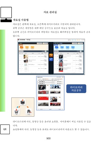 자료 관리실 자료실 사용법 자료실은 왼쪽에 자료실, 오른쪽에 라이브러리로 구분되어 관리됩니다. 왼쪽 공간은 개인만을 위한 비밀 공간으로 보호된 자료실 입니다. 오른쪽 공간은 라이브러리와 연동되는 자료실로 화면편집을 통하여 자료가 공유 됩니다. 라이브러리 자료공유 라이브러리에 사진, 동영상 등을 올리면 쇼핑몰, 마이홈에서 바로 사용할 수 있습 니다. QR 쇼핑몰에서 사진, 동영상 등을 올려도 라이브러리에서 다운로드 할 수 있습니다. 900