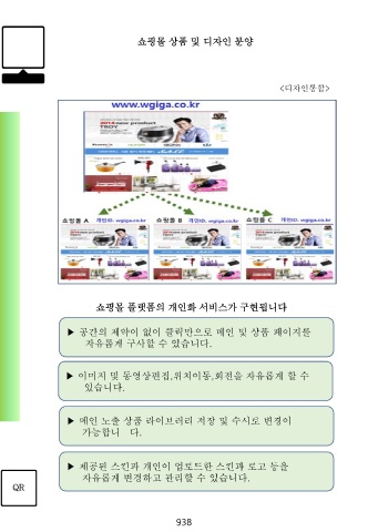 쇼핑몰 상품 및 디자인 분양 <디자인통합> 쇼핑몰 플랫폼의 개인화 서비스가 구현됩니다 ▶ 공간의 제약이 없이 클릭만으로 메인 및 상품 페이지를 자유롭게 구사할 수 있습니다. ▶ 이미지 및 동영상편집,위치이동,회전을 자유롭게 할 수 있습니다. ▶ 메인 노출 상품 라이브러리 저장 및 수시로 변경이 가능합니 다. ▶ 제공된 스킨과 개인이 업로드한 스킨과 로고 등을 자유롭게 변경하고 관리할 수 있습니다. QR 938