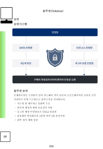 솔루션(Solution) 보안 보안시스템 솔루션 보안 전체솔루션을 구성함에 있어 하드웨어 적인 보안과 소프트웨어적인 보안을 모두 처리하기 위해 시스템으로 보안구성을 처리합니다. - 시스템 및 네트워크 방화벽 구성 - 관리자 계정의 최대 암호길이 사용 - 로그인 계정 비밀번호의 SHA2 암호화 - 암호화된 비밀번호를 2분할 하여 DB 분산저장 - 외부 접속 제한 설정 QR 956