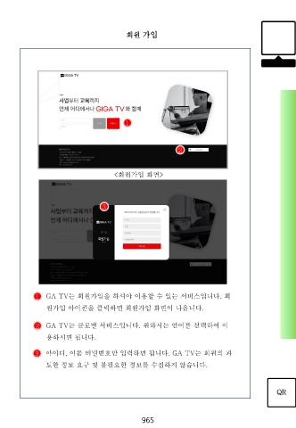 회원 가입 1 2 <회원가입 화면> 3 1 GA TV는 회원가입을 하셔야 이용할 수 있는 서비스입니다. 회 원가입 아이콘을 클릭하면 회원가입 화면이 나옵니다. 2 GA TV는 글로벌 서비스입니다. 원하시는 언어를 선택하여 이 용하시면 됩니다. 3 아이디, 이름 비밀번호만 입력하면 됩니다. GA TV는 회원의 과 도한 정보 요구 및 불필요한 정보를 수집하지 않습니다. QR 965