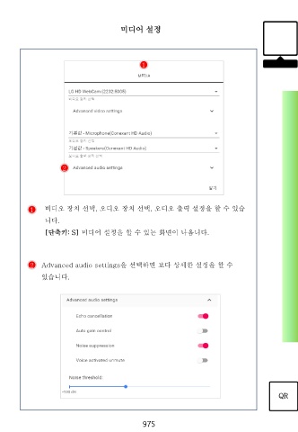 미디어 설정 1 2 1 비디오 장치 선택, 오디오 장치 선택, 오디오 출력 설정을 할 수 있습 니다. [단축키: S] 미디어 설정을 할 수 있는 화면이 나옵니다. 2 Advanced audio settings을 선택하면 보다 상세한 설정을 할 수 있습니다. QR 975