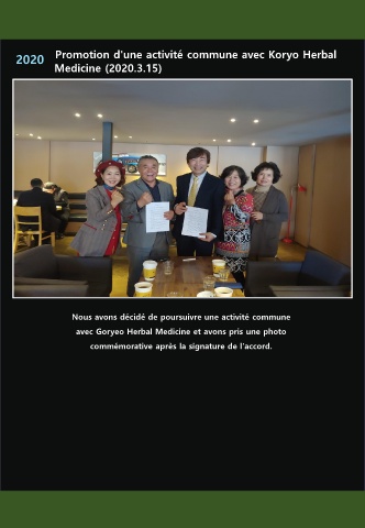 2020 Promotion d'une activité commune avec Koryo Herbal Medicine (2020.3.15) Nous avons décidé de poursuivre une activité commune avec Goryeo Herbal Medicine et avons pris une photo commémorative après la signature de l'accord.