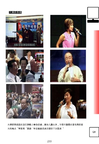 大师俱乐部 大师俱乐部还在汉江游轮上举办活动,参加人数太多,不得不选择在著名酒店最 大的地点。许景英、贤淑、申忠植总是表示期待下次见面。 QR 233