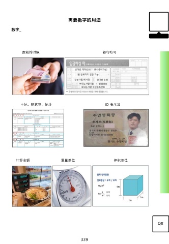 需要数字的用途 数字_ 数钱的时候 银行帐号 土地、建筑物、地址 ID 表示法 计算金额 重量单位 体积单位 QR 339
