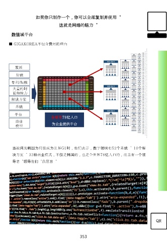 如果你只制作一个,你可以全部复制并使用。 这就是网络的魅力。 数值域平台 ■ GIGAKOREA不包含费用的理由 发展 知识 专利/版权 大量的时 间和精力 解决方案 系统 平台 全球有78亿人口 商业 模型 为企业提供平台 当被问及韩国为何能成为世界G1时,他们表示,数字领域有52个系统、 10个解 决方案、 32种商业模式,不仅是韩国的,也是全世界78亿人口的,而且有一个领 导者。领导他们。我愿意。 QR 353
