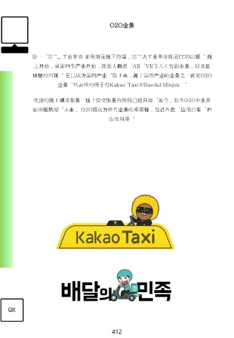 O2O业务 第一、第二_ 工业革命 如果说是线下的话,第三次工业革命就是IT的出现。 线 上开始,从第四个产业开始,就是大数据、AR、VR等人工智能业务,以及区 块链的出现。 它已成为第四产业。接下来,属于第四产业的业务之一就是O2O 业务。代表性的例子有Kakao Taxi和Baedal Minjok 。 便捷的线上请求服务、线下接受服务的格局已经开始。如今,很多O2O企业开 始出现热潮。未来, O2O将成为所有业务的重要轴,包括外卖、应用打车、酒 店使用等。 QR 412