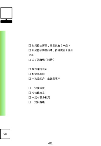 □ 如果你去那里,那里就有(产品) □ 如果你去那里的话,价格便宜(性价 比高) □ 去了就赚钱(回购) □ 落水穿透岩石 □ 积尘成泰山 □ 一次是客户,永远是客户 □ 一定要方便 □ 应该很容易 □ 一定有很多利润 □ 一定很有趣 QR 492