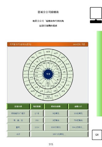 区域分公司经销商 地区分公司、经销商和代理机构 过期订阅费的现状 区域分类 地区数量 耗材注册费 金额小计 特别城市/广域市 17 号 9亿韩元 153亿韩元 市、县、区 250 3亿韩元 750亿韩元 董李_ 3,314 3000万韩元 994.2亿韩元_ _ 小计 1897.2亿韩元_ _ QR 515