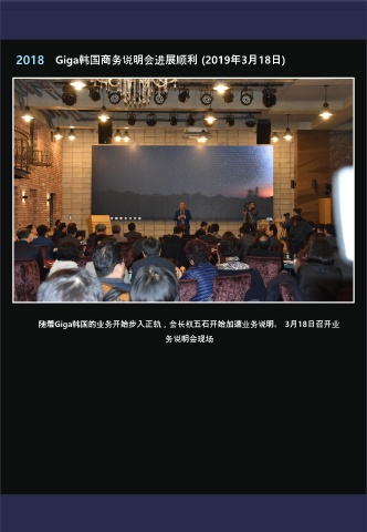2018 Giga韩国商务说明会进展顺利 (2019年3月18日) 随着Giga韩国的业务开始步入正轨,会长权五石开始加速业务说明。 3月18日召开业 务说明会现场