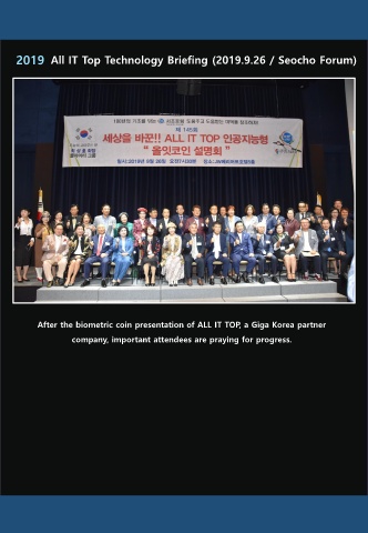 2019 All IT Top Technology Briefing (2019.9.26 / Seocho Forum) After the biometric coin presentation of ALL IT TOP, a Giga Korea partner company, important attendees are praying for progress.