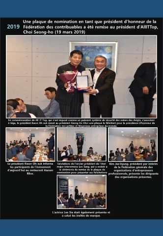 à Giga, le président Kwon Oh-suk remet au président Seong-ho Choi une plaque le félicitant pour la présidence d'honneur de