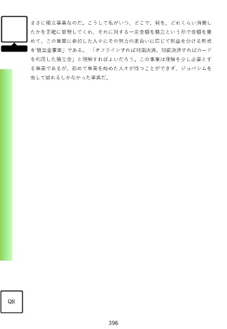 まさに積立事業なのだ。こうして私がいつ、どこで、何を、どれくらい消費し たかを正確に管理してくれ、それに対する一定金額を積立という形で金額を集 めて、この事業に参加した人々にその努力の度合いに応じて利益を分ける形式 を'積立金事業」である。 「オフラインすれば対面決済、対面決済すればカード を利用した積立金」と理解すればよいだろう。この事業は理解を少し必要とす る事業であるが、初めて事業を始めた人々が待つことができず、ジョバシムを 出して崩れるしかなかった事業だ。 QR 396