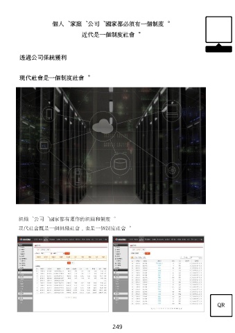 個人、家庭、公司、國家都必須有一個制度。 近代是一個制度社會。 透過公司係統獲利 現代社會是一個制度社會。 組織、公司、國家都有運作的組織和製度。 現代社會既是一個組織社會,也是一個制度社會。 QR 249