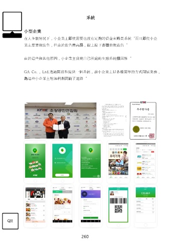 系統 小型企業 在大多數情況下,小企業主即使需要也沒有足夠的資金來購買系統。而且即使小企 業主想要做廣告,但由於廣告費高昂,線上線下都很難做廣告。 由於這些和其他原因,小企業主發現自己所處的生態系統很困難。 GA Co. , Ltd.透過開發和提供一個系統,讓小企業主以各種簡單的方式開展業務, 為這些小企業主增加利潤開闢了道路。 QR 260
