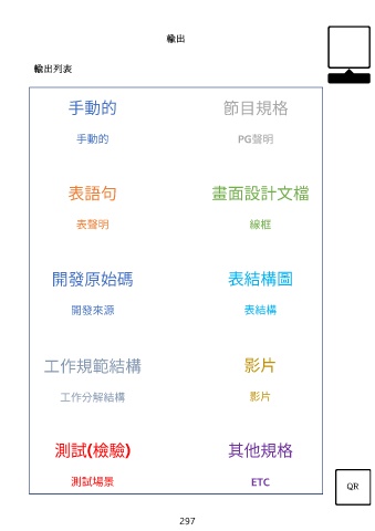 輸出 輸出列表 手動的 節目規格 手動的 PG聲明 表語句 畫面設計文檔 表聲明 線框 開發原始碼 表結構圖 開發來源 表結構 工作規範結構 影片 工作分解結構 影片 測試(檢驗) 其他規格 測試場景 ETC QR 297