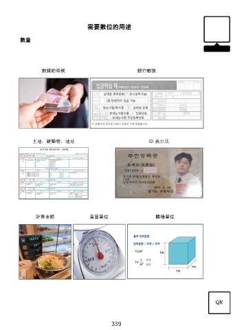 需要數位的用途 數量 數錢的時候 銀行帳號 土地、建築物、地址 ID 表示法 計算金額 重量單位 體積單位 QR 339