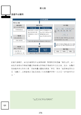 新大陸 透過平台獲利 在數位領域內,有O2O業務及多元業務業務。附屬特許經營權。而在這裡,有一 家提供各種有形和無形產品和各種有形和無形業務的多元化企業,還有一家為其 業務提供所有解決方案、系統和產品並進行維護、管理、維修、運營和運營的公 司。我斷言,這家數域公司就是創造了未來成為世界第一大公司一切可能性的公 司。 “這是21C平台的時代” QR 376