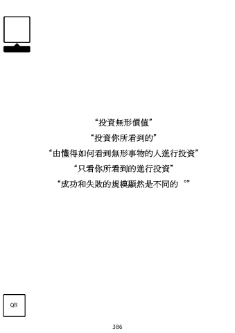 “投資無形價值” “投資你所看到的” “由懂得如何看到無形事物的人進行投資” “只看你所看到的進行投資” “成功和失敗的規模顯然是不同的。” QR 386