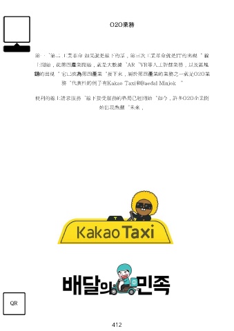 O2O業務 第一、第二 工業革命 如果說是線下的話,第三次工業革命就是IT的出現。 線 上開始,從第四產業開始,就是大數據、AR、VR等人工智慧業務,以及區塊 鏈的出現。 它已成為第四產業。接下來,屬於第四產業的業務之一就是O2O業 務。代表性的例子有Kakao Taxi和Baedal Minjok 。 便利的線上請求服務、線下接受服務的格局已經開始。如今,許多O2O企業開 始出現熱潮。未來, QR 412