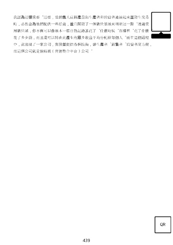 我認為這很重要。這樣,當銷售人員將產品與生產者和消費者連接起來並發生交易 時,必然會為他們提供一些好處,並且開發了一個數位領域來明確這一點。透過使 用數位域,你不僅可以像帳本一樣自動記錄誰花了、什麼時候、在哪裡、花了什麼、 花了多少錢,而且還可以將由此產生的眾多收益平均分配給每個人。而在這個過程 中,就出現了一家公司,開發並提供各種技術,讓生產者、銷售者、消費者更方便, 而這個公司就是號碼域(資源整合平台)公司。 QR 439