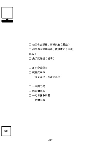 □ 如果你去那裡,那裡就有(產品) □ 如果你去那裡的話,價格便宜(性價 比高) □ 去了就賺錢(回購) □ 落水穿透岩石 □ 積塵成泰山 □ 一次是客戶,永遠是客戶 □ 一定要方便 □ 應該很容易 □ 一定有很多利潤 □ 一定很有趣 QR 492