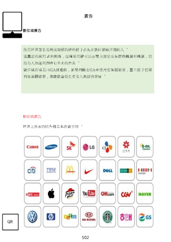 廣告 數位域廣告 使用世界著名名稱或商標的權利授予首先在數位領域註冊的人。 當真正的使用者出現時,這種使用權可以由雙方設定交易價格轉讓和轉讓,而 沒有人知道利潤會有多大的差異。 數位域市場是由GA創建的,如果判斷在GA中使用它無關緊要,並且授予它權 利也無關緊要,那麼就會發生更令人驚訝的事情。 數位域廣告 世界上所有的廣告都是基於數字的。 QR 502