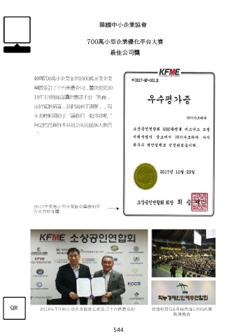 韓國中小企業協會 700萬小型企業優化平台大賽 最佳公司獎 韓國700萬小企業主和1000萬專業企業 團體簽訂了平台供應合同,並決定從20 19年1月開始認真供應該平台。然而, 由於冠狀病毒,我們遇到了困難,,現 在是時候開始了。讓我們一起出發吧。 阿里巴巴和許多其他公司也能加入我們 。 2017年榮獲小型企業協會舉辦的平 台大賽特等獎 QR 2018年7月與小型企業協會正式簽訂平台供應合約 使用印度GA系統創造1000萬個 就業機會 544