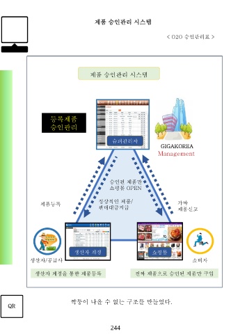 제품 승인관리 시스템 < O2O 승인관리표 > 제품 승인관리 시스템 등록제품 승인관리 슈퍼관리자 GIGAKOREA Management 승인된 제품만 쇼핑몰 OPEN 정상적인 제품/ 제품등록 가짜 판매대금지급 제품신고 생산자 계정 쇼핑몰 생산자/공급사 소비자 생산자 계정을 통한 제품등록 진짜 제품으로 승인된 제품만 구입 짝퉁이 나올 수 없는 구조를 만들었다. QR 244