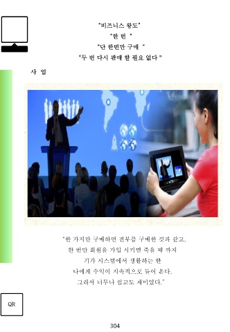 “비즈니스 왕도” “한 번“ “단 한번만 구매“ “두 번 다시 판매 할 필요 없다" 사 업 “한 가지만 구매하면 전부를 구매한 것과 같고, 한 번만 회원을 가입 시키면 죽을 때 까지 기가 시스템에서 생활하는 한 나에게 수익이 지속적으로 들어 온다. 그래서 너무나 쉽고도 재미있다.” QR 304